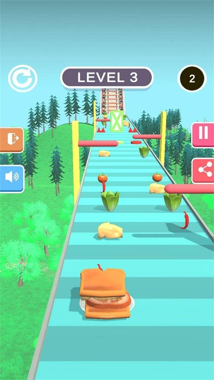 三明治酷跑中玩家们操控的是可爱的三明治前往挑战,你可以在闯关的过程中收集各种食材来完成不同的三明治满足食客们的需求,同时在关卡中还有很多你需要避开的机关,他们会让你的三明治变得不好吃。