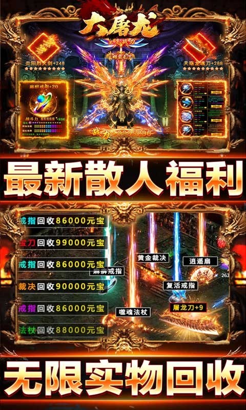大屠龙光速神器是一款非常有趣的角色扮演游戏,传奇竞技游戏,轻松回收传奇实物道具,大量的福利等待玩家去获取,非常高的游戏爆率,刺激竞技,刀刀切割暴击,一秒无限刀,边带的光柱,邀请传奇兄弟一起去战斗,准点点刺激沙攻竞技,沙城决战,沙城捐献,轻松获取终极奖励,组建英勇的传奇队伍,非常值得去尝试的传奇竞技游戏。