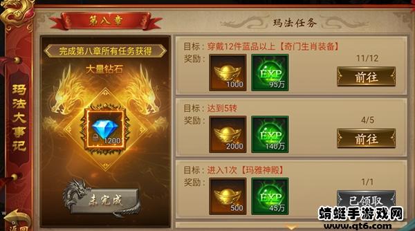 2、完成玛法大事记任务可以获得大量元宝、精英。完成完整篇章,还能领取绑钻、生肖、锋芒装备!
