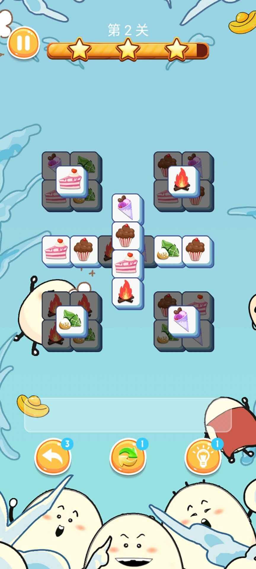 1.和羊了个羊一样的玩法,通过点击相同的三个图案,在卡槽中自动消除。