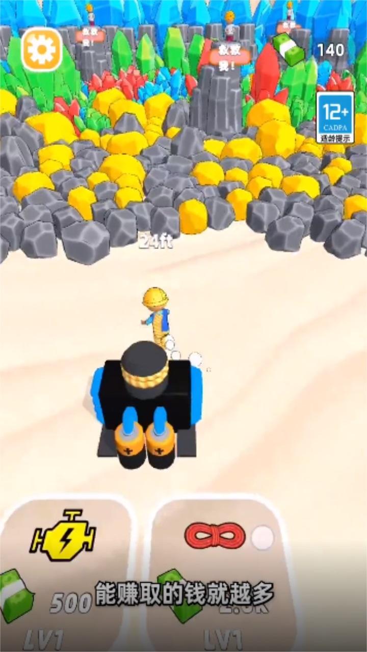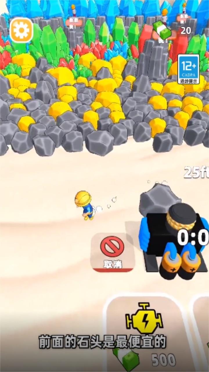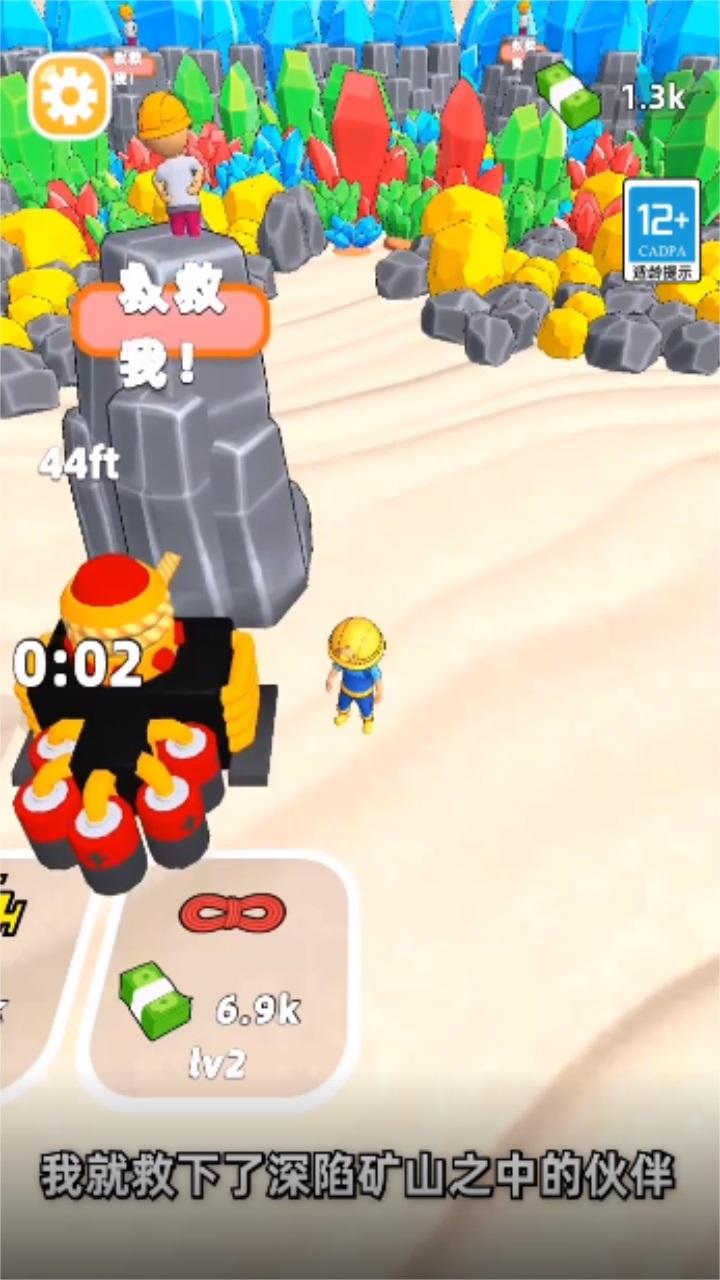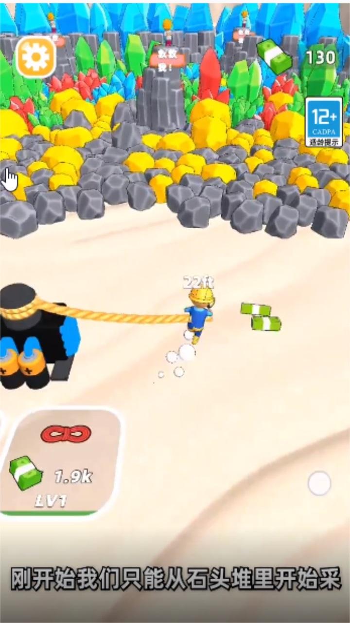 采矿人生是由深圳市云顶天下科技有限公司推出的一款挖矿赚钱的手游,开局一人一台挖矿机,一开始我们只能从石碓里面找矿石,前面的石头挖掘出来的价值一般般,要想赚钱,我们必须要挖掘后面的矿石,或者是救助被困的同伴,购买多台挖矿机器,和自己的同伴一起挖矿。