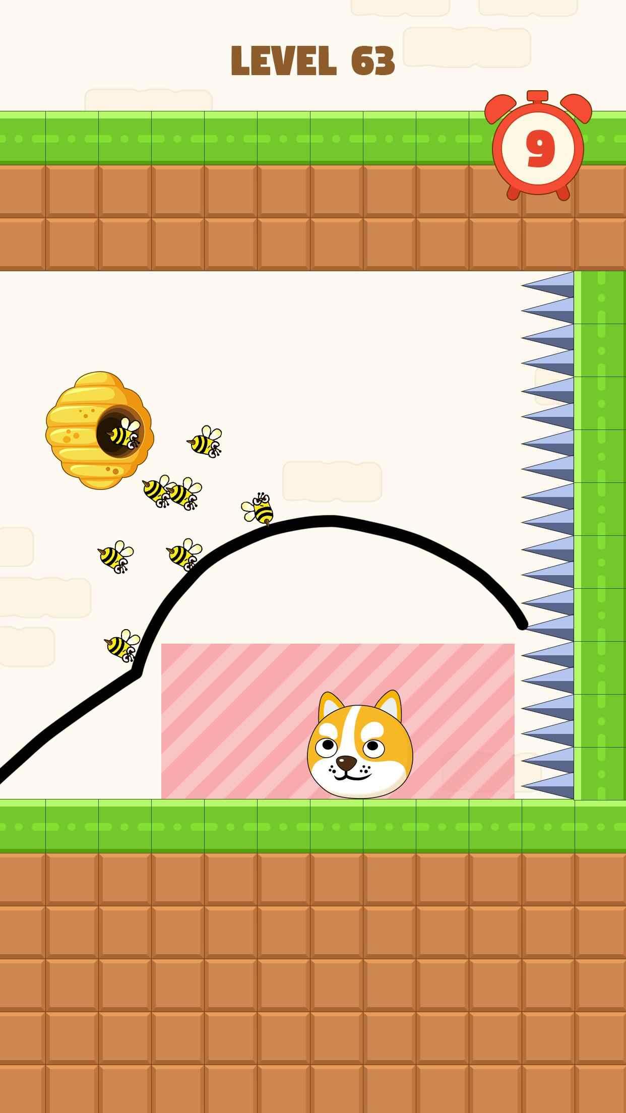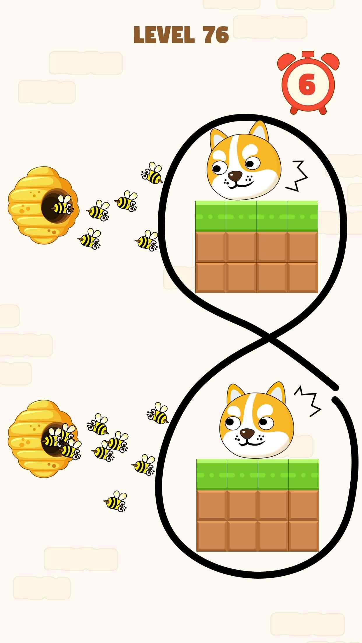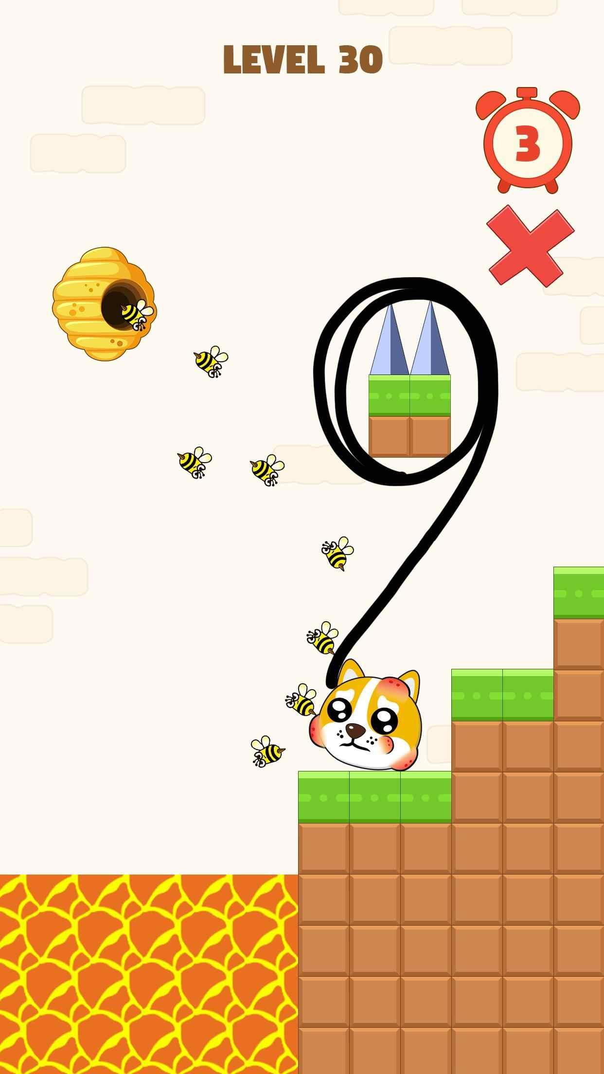 拯救狗狗是一款益智小游戏,玩家在游戏中需要通过画线的方式来形成道具保护狗狗不被蜜蜂蛰到,每个关卡都是不同的场景障碍,游戏考验您的智力,有些关卡不仅有蜜蜂蛰,还有尖刺和障碍,玩起来更加的烧脑。