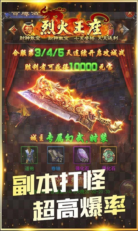 烈火王座福利版是一款角色扮演游戏,刺激产权局竞技游戏,非常经典的传奇玩法,三职业传奇竞技游戏,非常经典的画面,支持离线挂机的游戏操作,多人在线开启刺激竞技,再现传奇当年的辉煌,免费尝试游戏,自由开放的传奇世界,非常流畅的操作过程,重度福利资源版本,全屏特效,全程沙攻竞技,非常值得尝试的传奇竞技游戏。