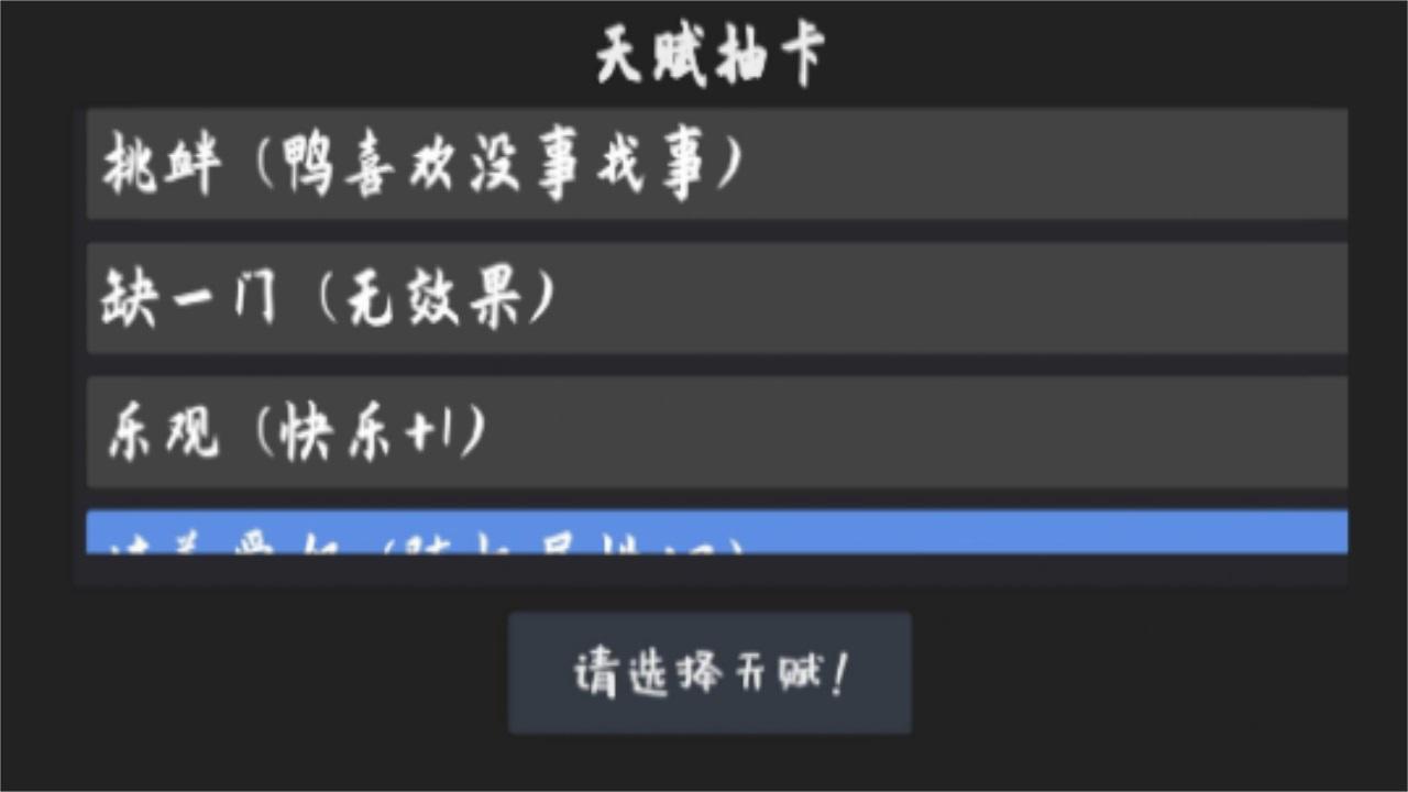 鸭的一生是由谷德工作室推出的一款休闲手游,一首歌,走完鸭的一生。在本站下载安装这款游戏,触摸并点击开始,选择天赋抽卡,完成自己的一生的属性选择,后期就会认识到更多的好友,一起经历自己的一生。