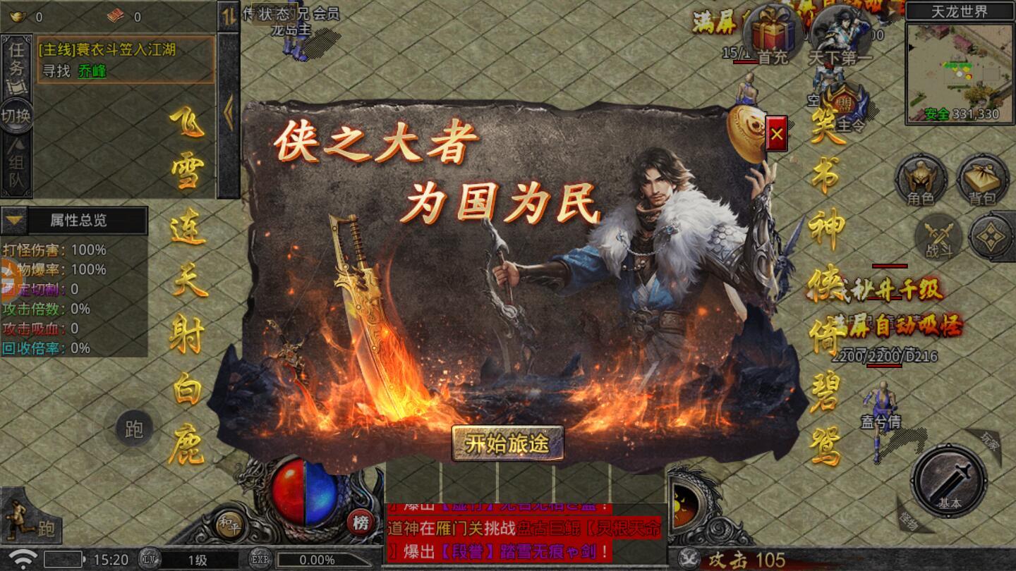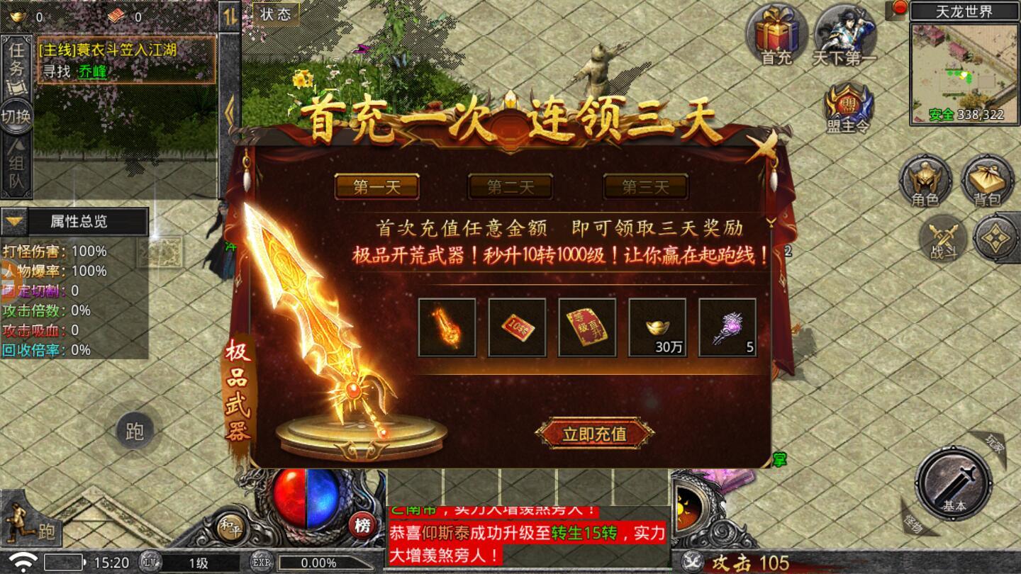 1000%加速,1500%爆率,刀刀烈火,刀刀光柱,3分钟挂出50W元宝!