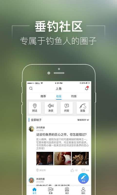 钓鱼人社区:结识周边志同道合的钓友,分享鱼获晒钓具秀装备,了解钓友的新动态,相约钓场垂钓;亦可发表与评论帖子,请达人为你答疑解惑,分享经验交流进步,共享垂钓乐趣。