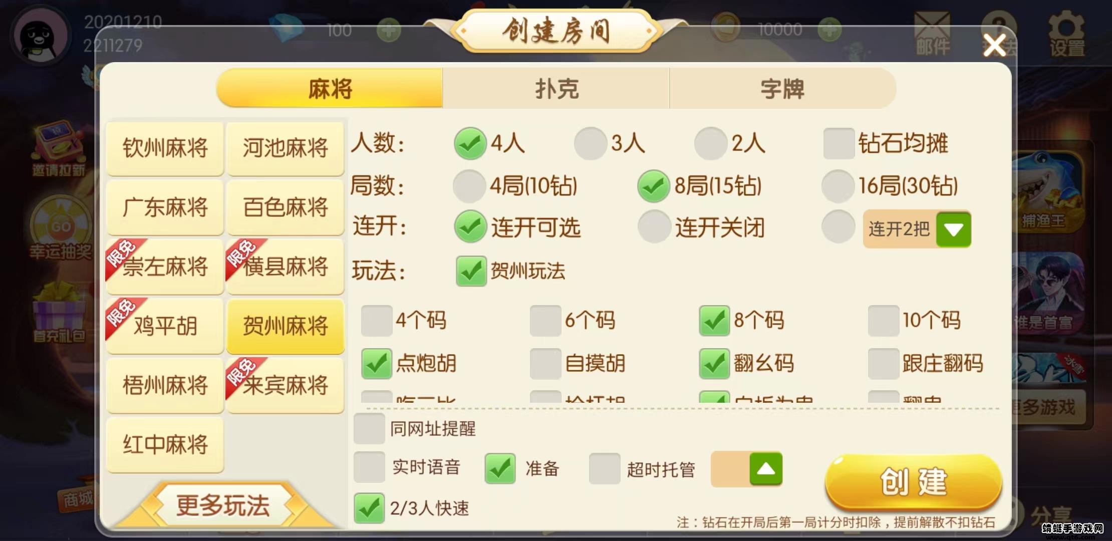 天天爱贺州麻将的玩法非常的具有当地的特色,游戏融合了经典的玩法和多人对局的模式让你可以在游戏中和你的好友们一起进行游玩,支持建设房间功能让你可以更好的邀请你的朋友们,并且游戏中还带有很多当地方言的交流模式让玩家们感受浓浓的家乡味。