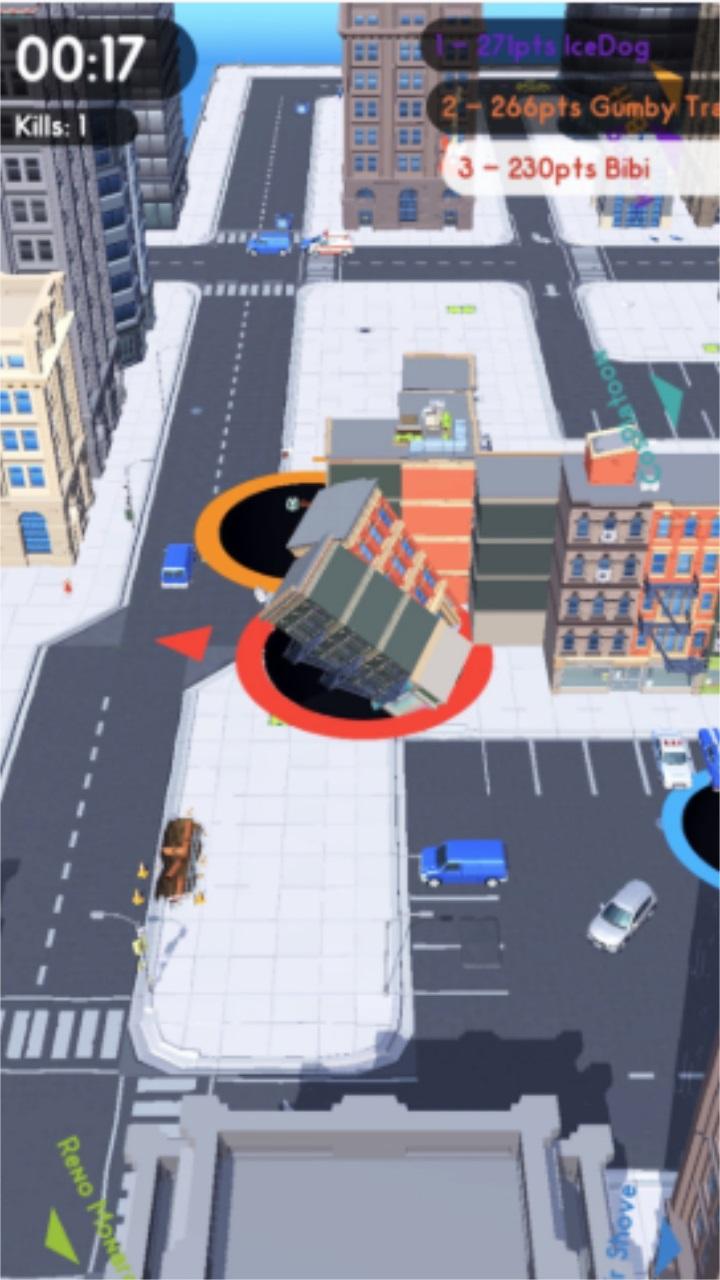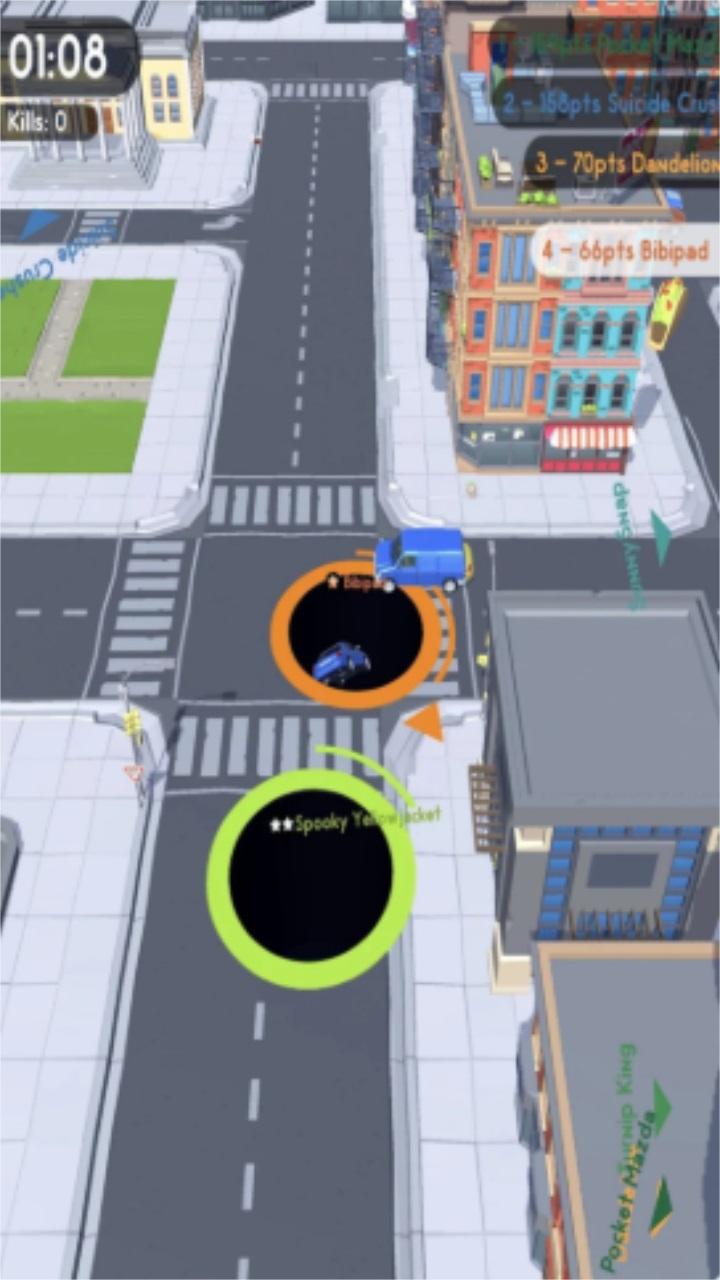 1、开局一个洞,发育全靠吞。大洞吞小洞,生存要靠拼,触摸屏幕上的任何位置并用手指拖动。将建筑物、道具和道路收集到镇上的洞里。吃掉城里的所有东西。成为最大的黑洞。