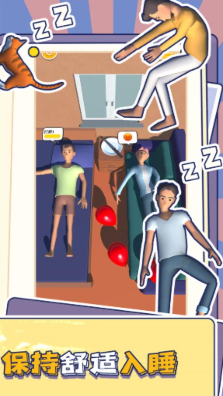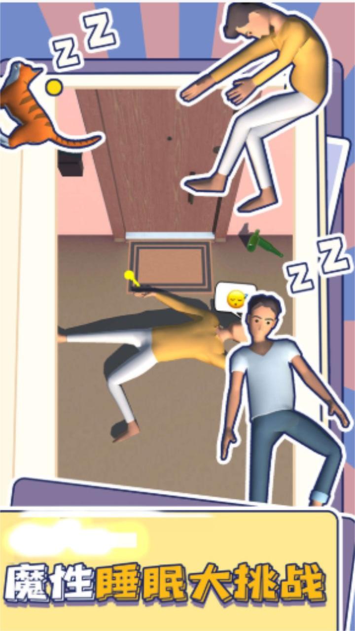 5、是一位爱睡懒觉的人,他幻想着可以在睡梦中完成一天的工作事宜。现在我们来帮助他,点触拖拽屏幕操作角色,注意了,在不吵醒角色前提下完成所定的任务,动静不要太大,否则李被吵醒会生气的。