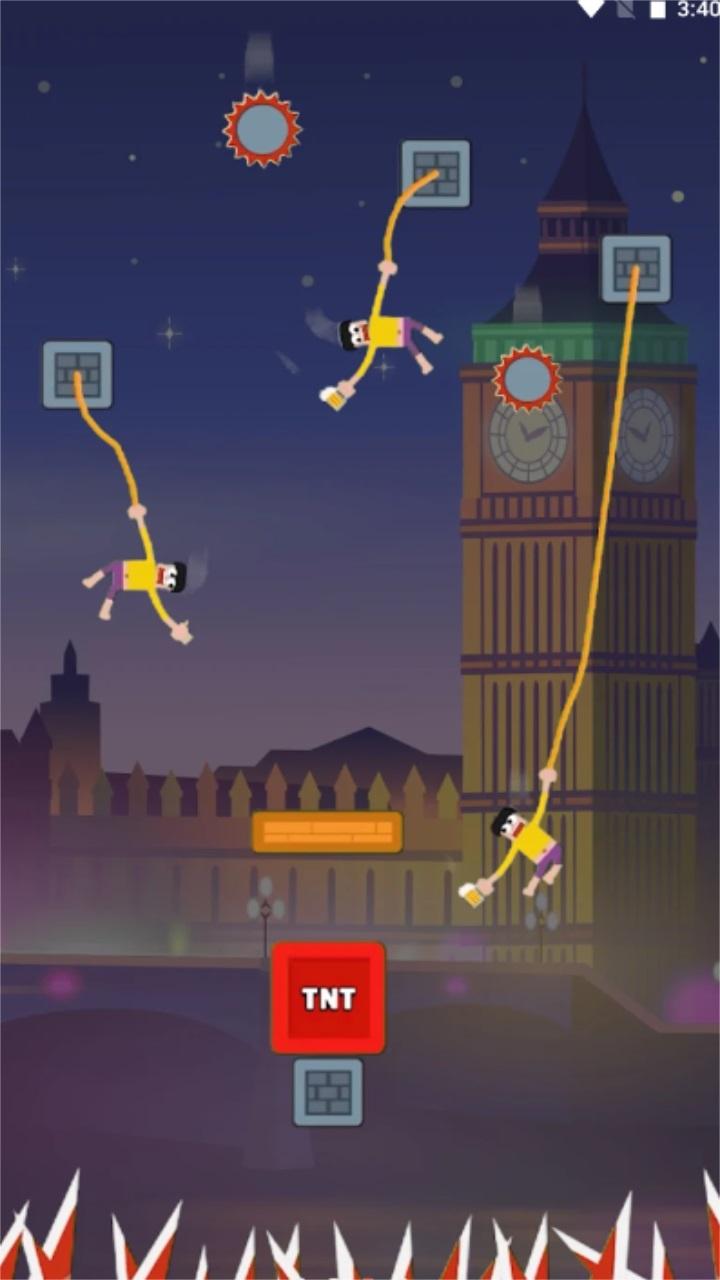 4、连接正确的点,将有十几个点来欺骗你,拯救朋友和杀死恶魔的唯一方法就是选择正确的点。用绳子扔到正确的地方。小心你的举动。避开锯轮和炸弹,否则你会掉进荆棘里而死。