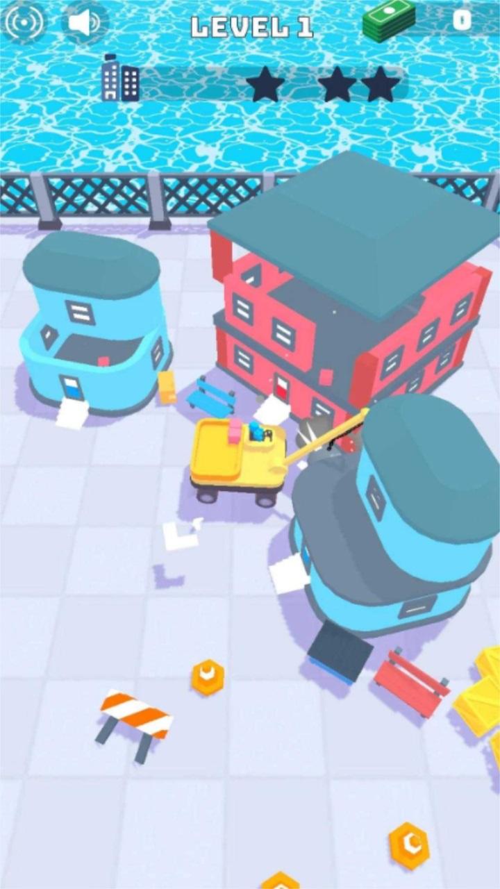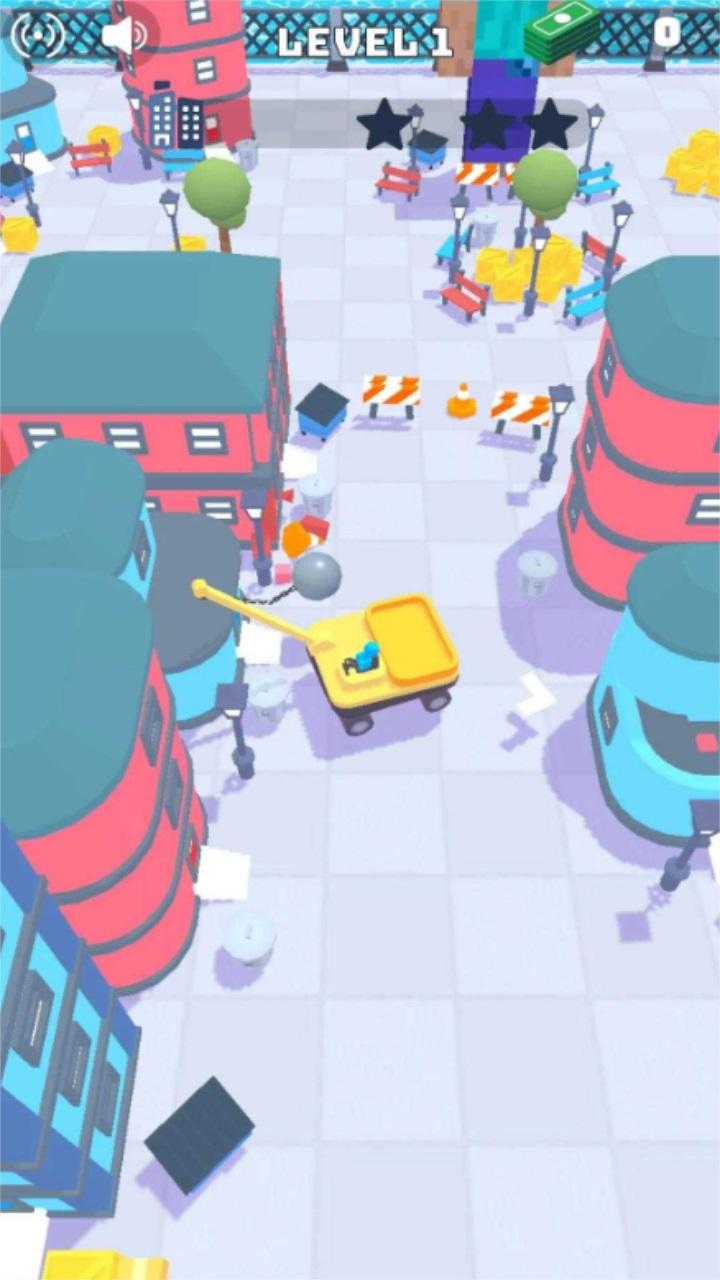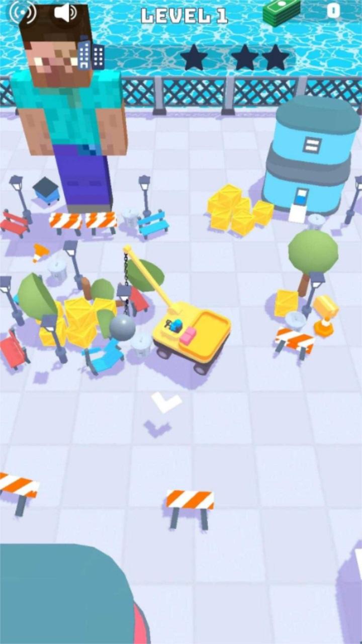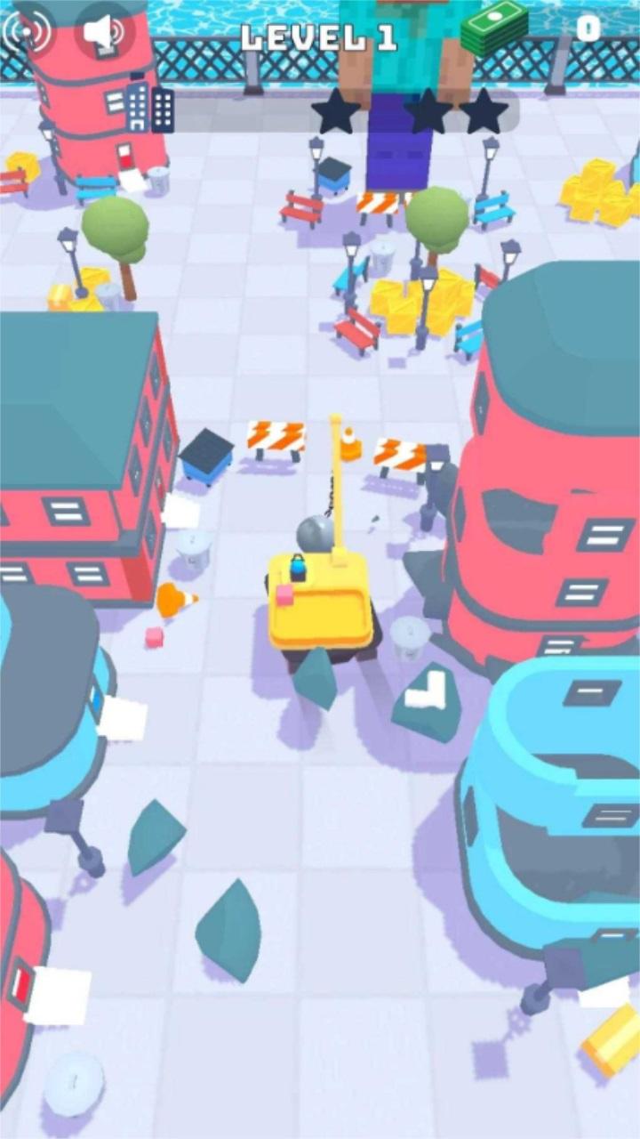 2、十分减压的闯关玩法,玩家通过加时塔吊来挥动巨大的圆球左右摆动来摧毁建筑残骸。