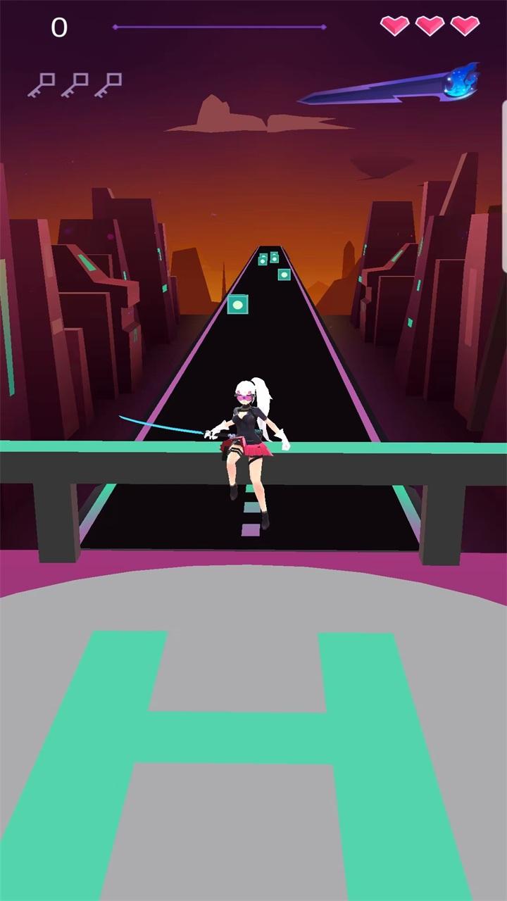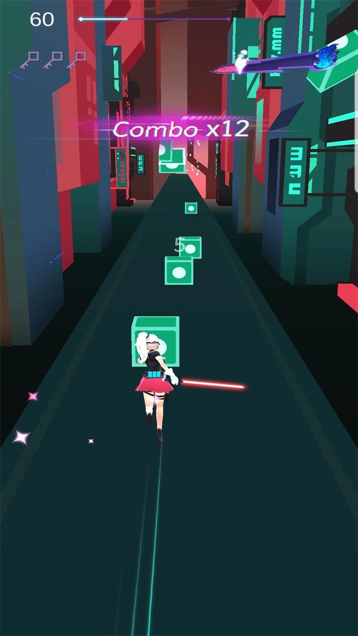 跳舞狩猎手游,砍砖块和音游的两种形式为玩家们带来全新的不同体验,你需要控制我们的女主角通过不断地闯关来跟随者关卡中的音乐来不断地击碎沿途的方块,击碎的方块越多你所获得的积分也就越高。
