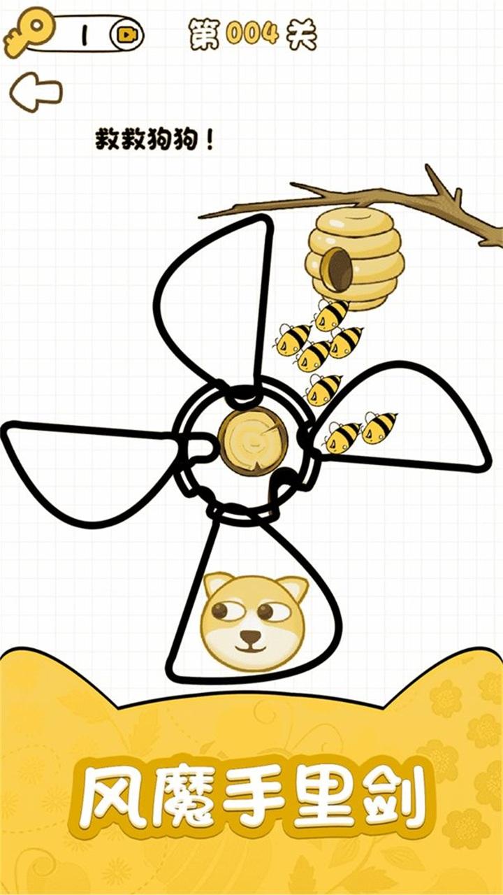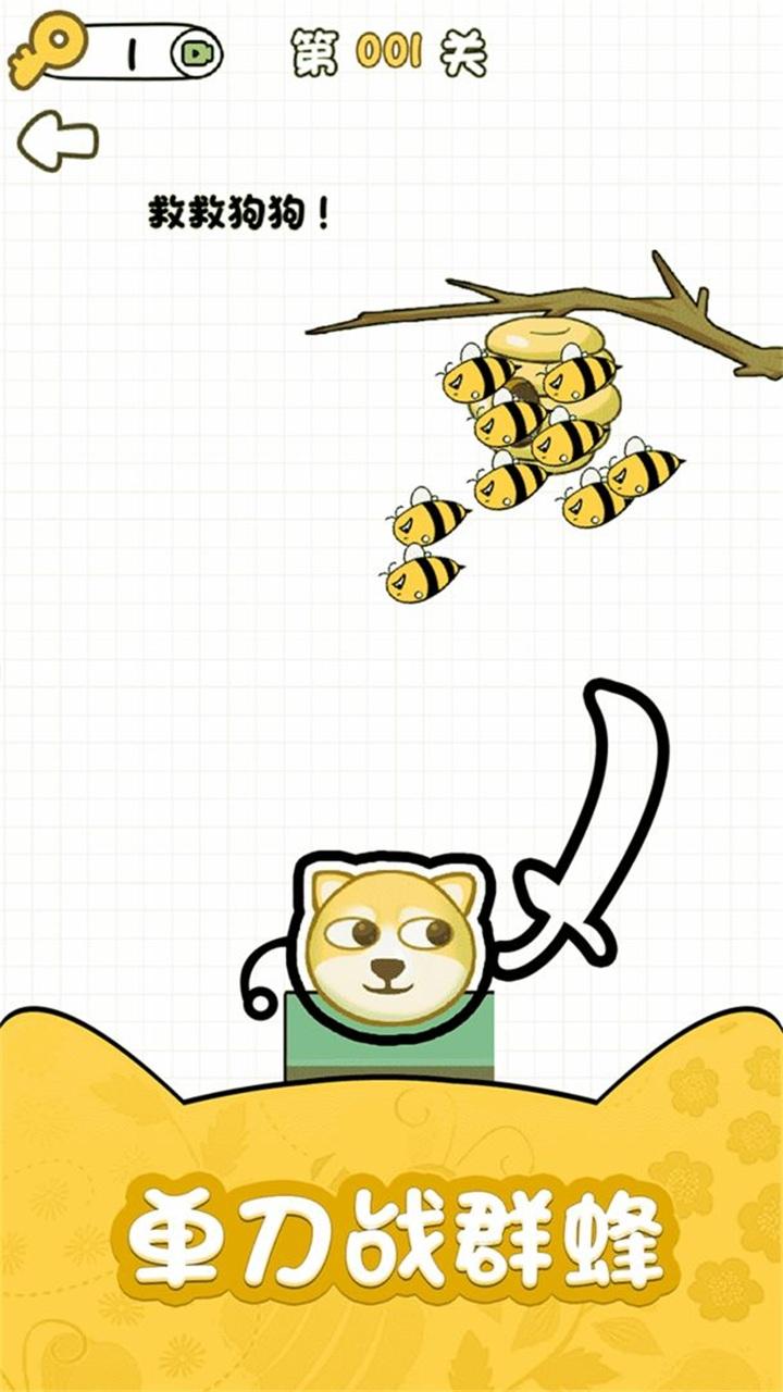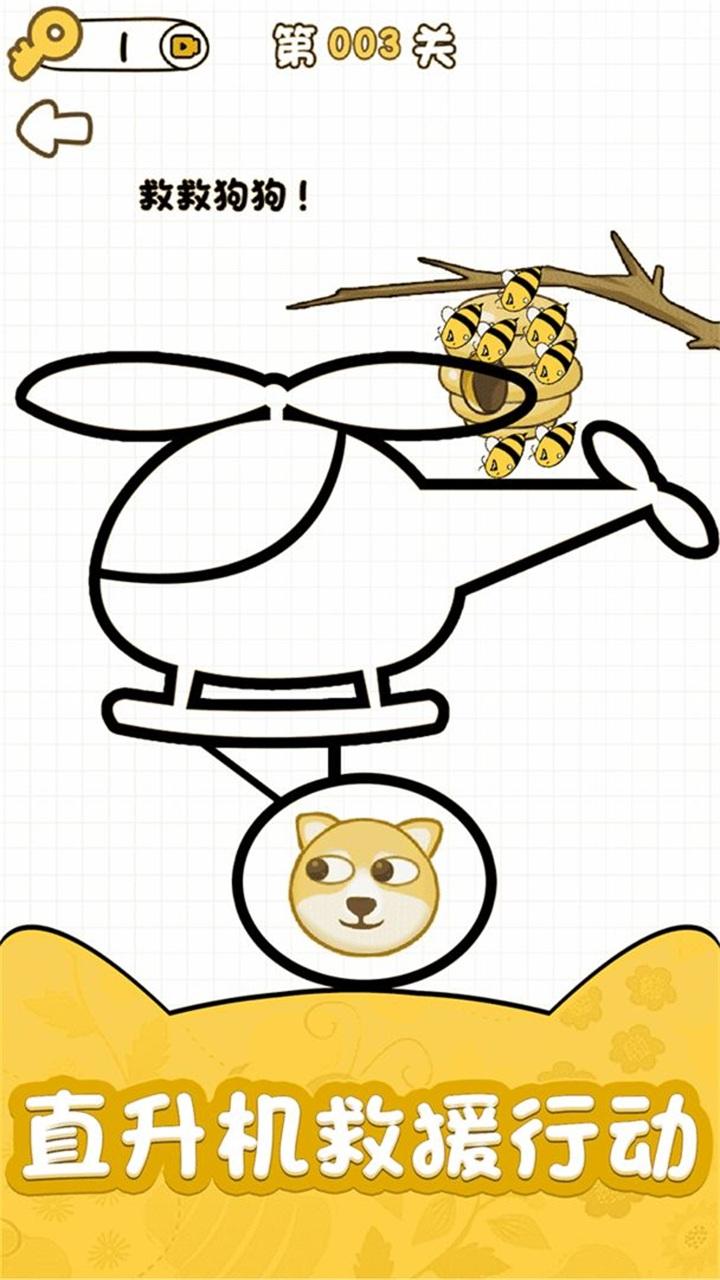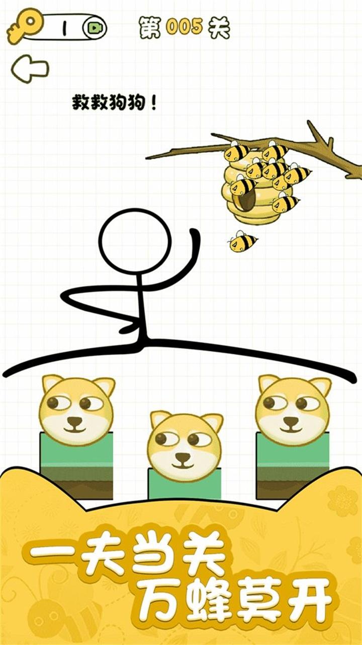 我们的主角就是一个会滚的狗头,就好像不小心就会滚下悬崖的那种,这个狗头说起来也怪,为什么老是要去危险的地方,安安静静养老不好吗,言归正传,玩法是画线解救狗狗,不让蜜蜂蛰到狗狗就算通关,游戏中的场景也是多姿多彩,比较多的还是悬崖了也有岩浆之类的场景,不过都有一个特点,就是碰到就没,这些场景也就是增加了一些趣味性而已,游戏中不只是解救一只狗狗,有可能会碰到两只狗狗或者更多,也有大狗背小狗的等等之类的,也有多个丰巢来蛰狗狗。