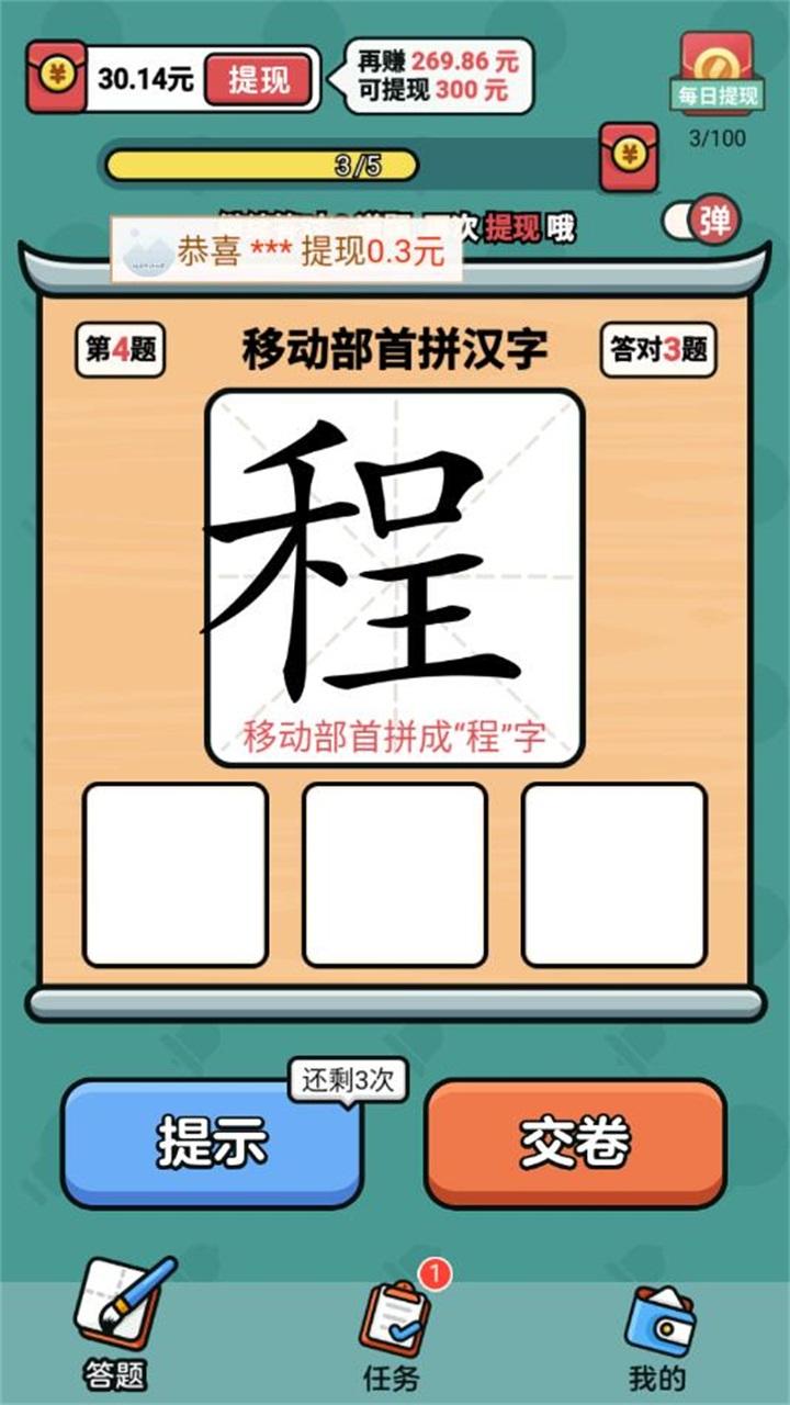 模式很简单,玩家每完成一次汉字拼图,就可以得到一个奖励。