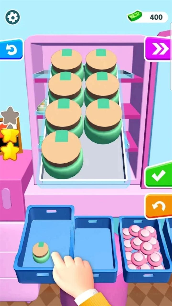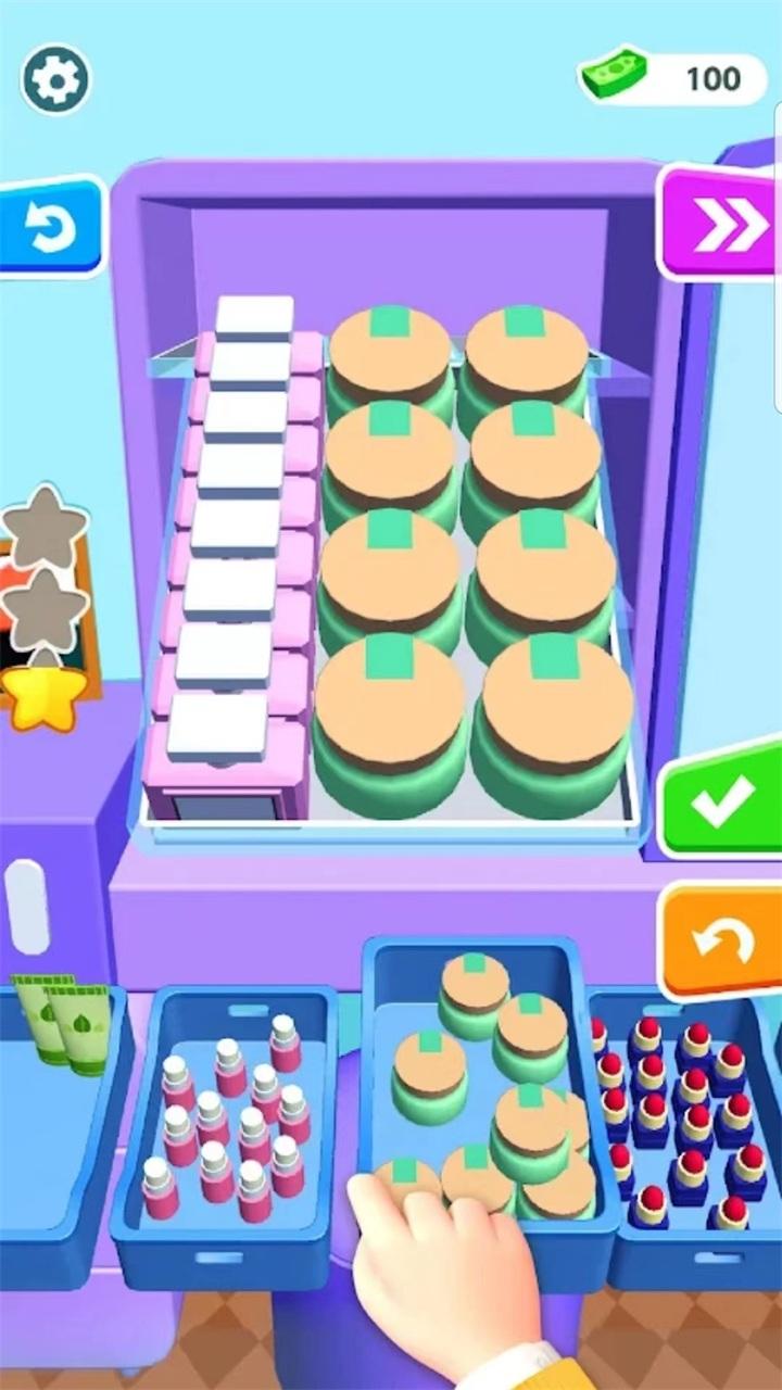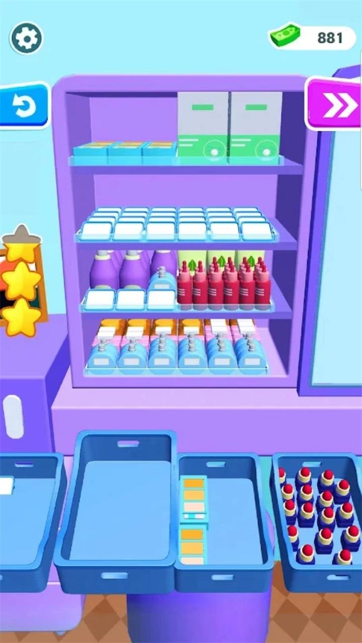 他的游戏玩法就是让你摆东西。打个比方吧,就好比你去一些小超市打工,然后里面有一份,就是你需要把货架上的所有商品排满的这么一份工作,到了晚上空的时候就得排放上去。有打过的应该了解,或者说你常看一些动漫的话,应该也会出现这种情景。总之游戏玩法你可以理解为这个,但可供你摆的地方只有冰箱。啊对,没有别的了。整个摆放的过程怎么说,其实无非就是点点点点点,但是要说细节设计也不是没有,比如说你稍微点了有一点偏差,它的位置就会偏移,而且位置一旦偏移,你就不能完完全全的把所有的东西都摆满,肯定会漏那么一两个在外头。但是这个我并不觉得是什么好设计。啊,为什么这么说呢?因为大伙都是手机屏幕对吧,