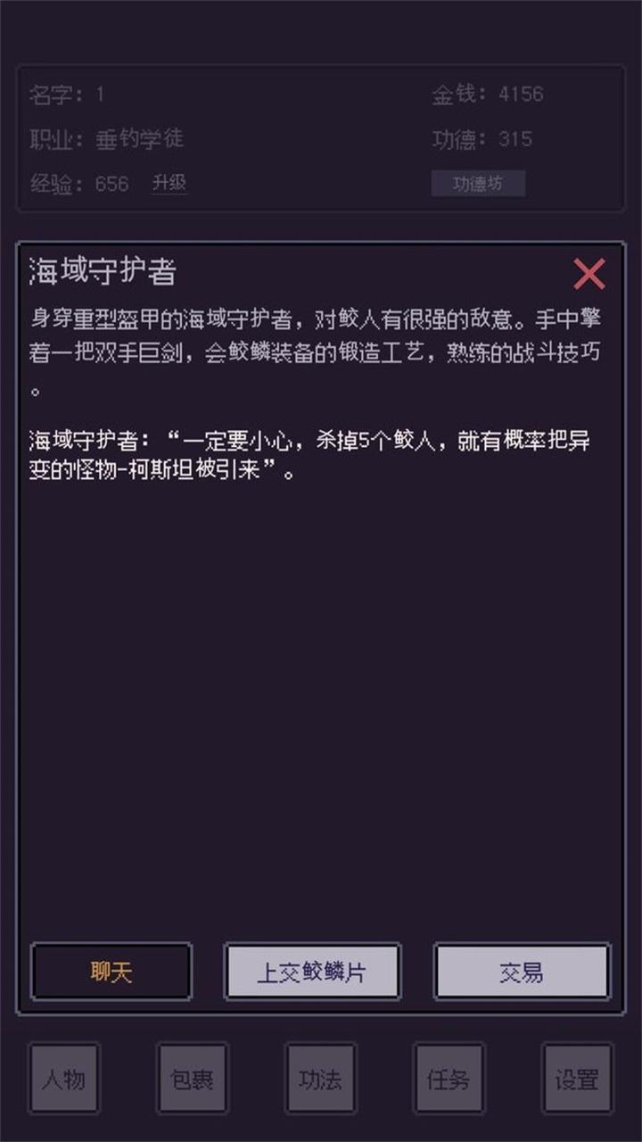 海尽垂纶是一款航海与垂钓相结合的开放性文字游戏。玩法相对于市面上的文字游戏来说比较新颖,目前有垂钓玩法,同时还带有剧情系统和战斗系统,器游戏的像素画风更是让人眼前一亮,画面体验感非常好。还有多种未知的玩法等你来体验!
