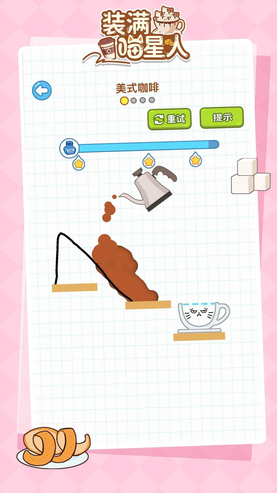 装满喵星人是一款画线解谜游戏,游戏还加入了猫咪的主题,玩家需要通过画线来引导咖啡流入到杯子中,让喵星人制作出各种美味的咖啡,学习新的咖啡制作方法,清新的游戏画风让您玩起来也没有那么多的压力。