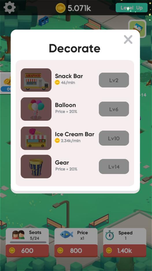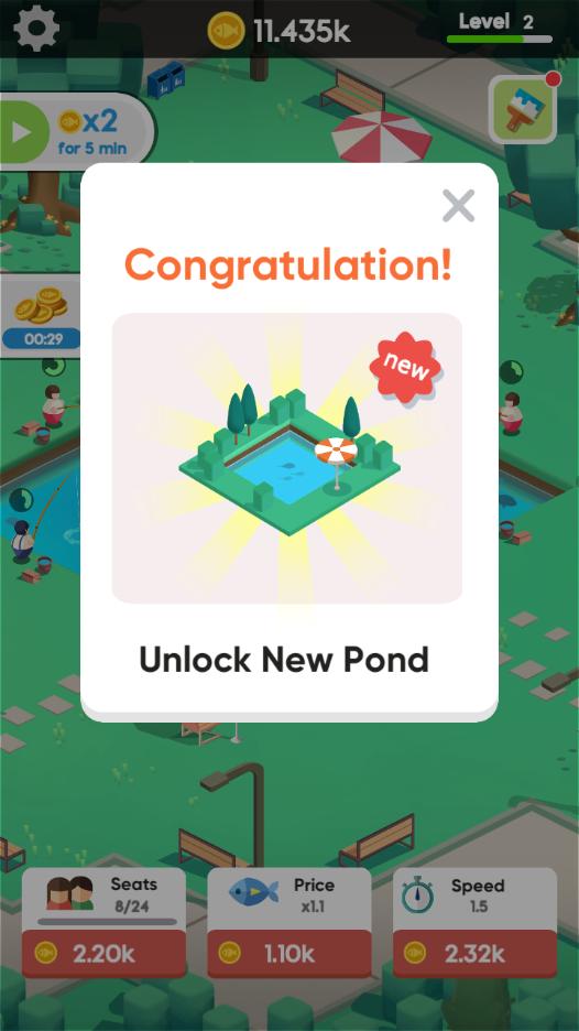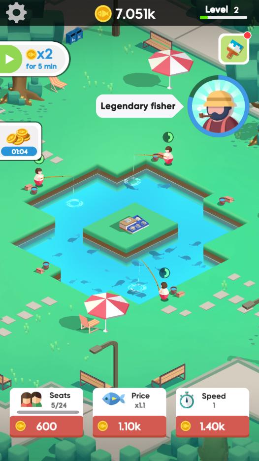 在其他放置类钓鱼游戏中,玩家通常是作为一个钓鱼的人进行游戏的,而在这款游戏中,钓鱼的人是为玩家打工的,玩家成为了老板。玩家每点击一次画面的空白部分,在鱼塘边上的钓鱼人就会钓起一次鱼,当然也并不是你手速越快钓的鱼就能越多,游戏中钓鱼人的行动是有CD的,玩家可以通过购买道具来减少钓鱼人的行动CD,从而能在更短的时间内钓起更多的鱼。