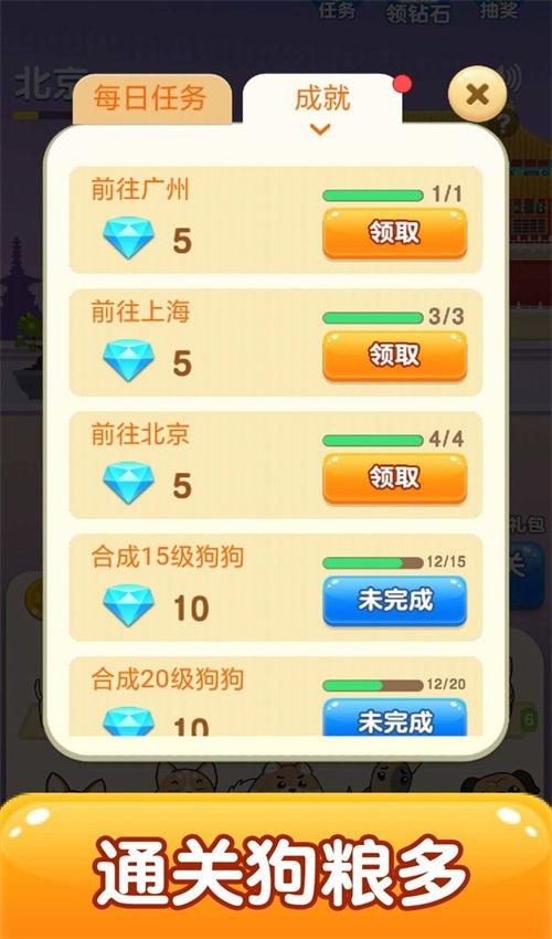 游戏主要以旅行为主要玩法,通过合成狗狗进行旅行;