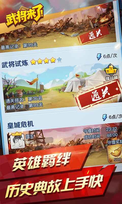 武将来了是一款以三国为背景的搞笑策略游戏,超多三国知名角色等您来获取,合成玩法简单轻松,解锁各种英雄搭配您的阵容,游戏内容丰富,关卡多多,还有装备武器等您获取,喜欢玩三国游戏的人不要错过哦。