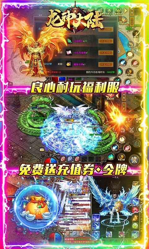 4.充值货币超级好打,地图多、装备爆率全面提升,上线送一整背包充值券,天天领无限抽奖券抽充值;