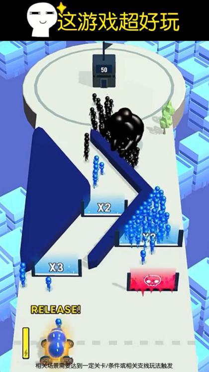 游戏玩法很简单,玩家只需要控制初始的小人,再通过自己的选择,比如说路上会有一些增加多少人或者本身的人数乘以多少倍这些,这方面就需要考验自己的反应力快一点了,不会有人会搞错这种小学算术题吧(?ω?)。然后在路上躲避障碍物,路途中会遇到一些红色的小人,我们的蓝色小人数量要比它们的人数大才能过得去,也就是蓝色的一个小人碰到红色的一个小人就被抵消掉。