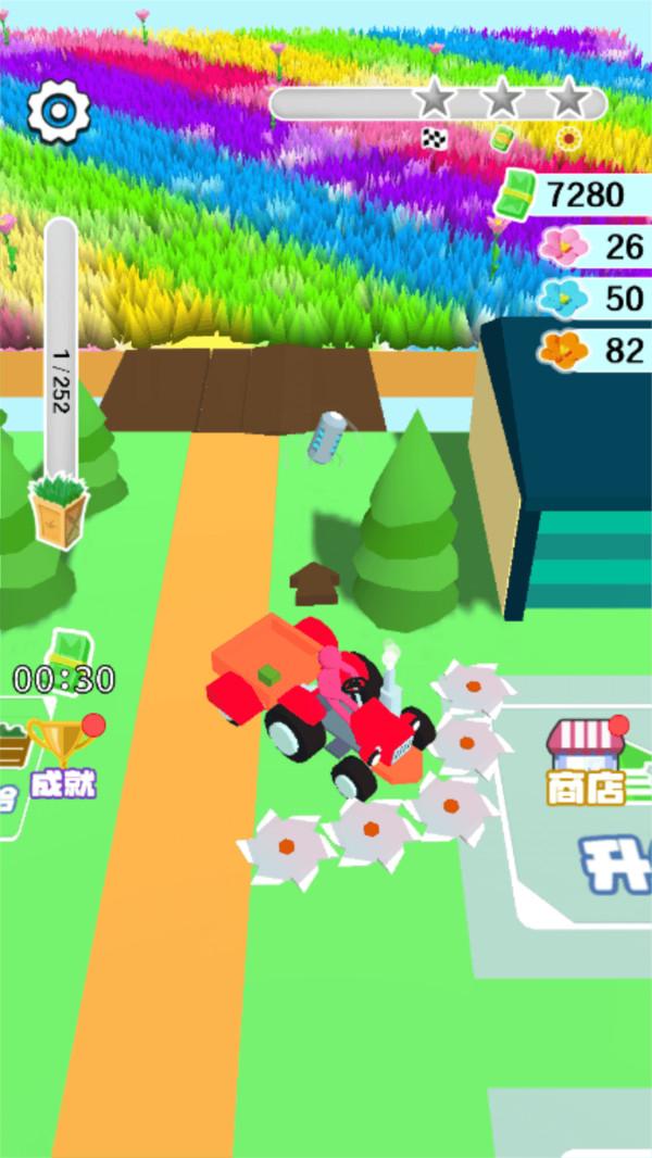 2、赚取的金币可以用来解锁新的割草机,使用更加强劲的收割机来更加快速的收割你的草地吧;