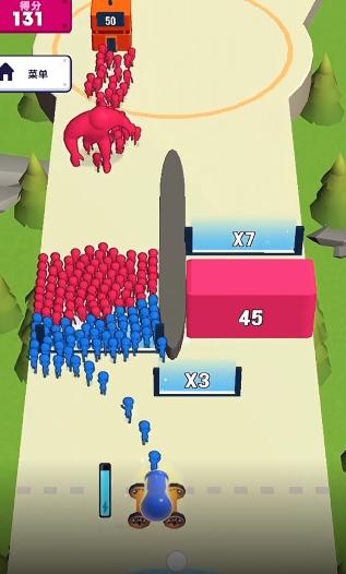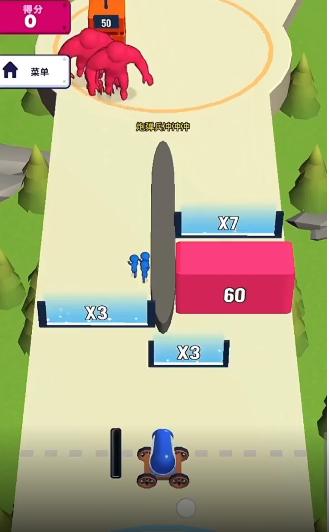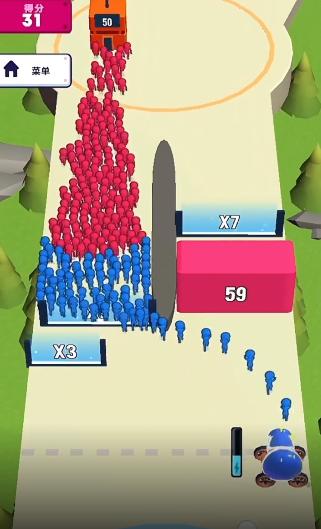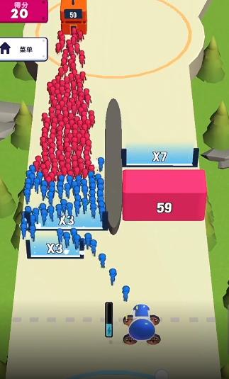 关卡开启后,玩家可以控制炮台发射小人,通过控制炮台发射方向,可以控制小人的行进路线,经过地图上的加倍区域后,小人就会直接增加到对应倍数,比如10个小人经过3倍区,此时小人就会变成30个,小人会越来越多,当炮台能量积攒满后,还可以出现大黄人,拥有更强的战斗力。而小人通关关卡通关目标是摧毁对面小红人传送门。若是遇到关卡无法通关的话,我们是可以重复挑战,调整小人方向,尽量让小人拥有更多的数量。
