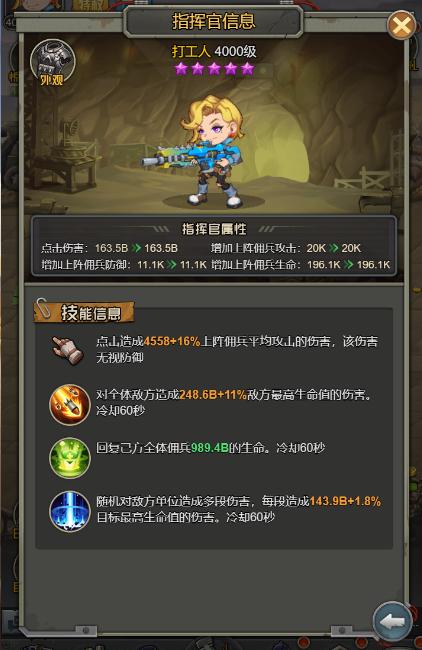 指挥官可使用金币升级,等级越高,点击伤害越高,技能伤害也越高,升到一定等级还可以进阶;