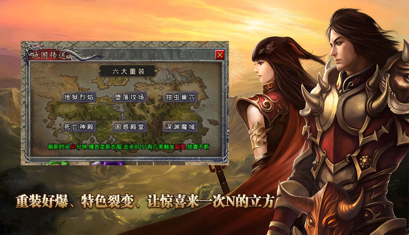 4.经典怀旧风格,国王称霸,疯狂刷牙boss,随机采集装备,获取大量物资,皇城争霸,自由作战。