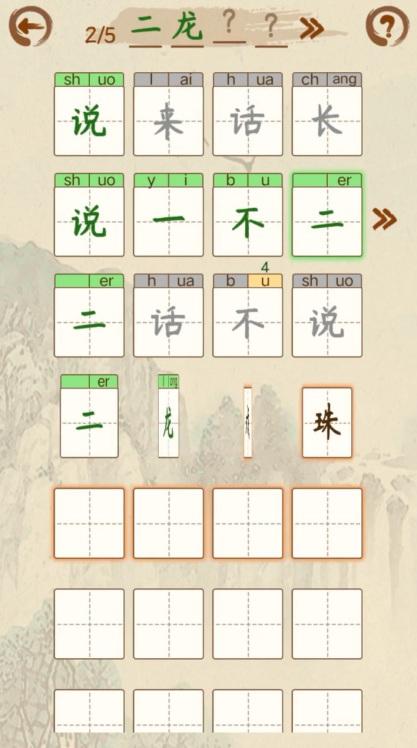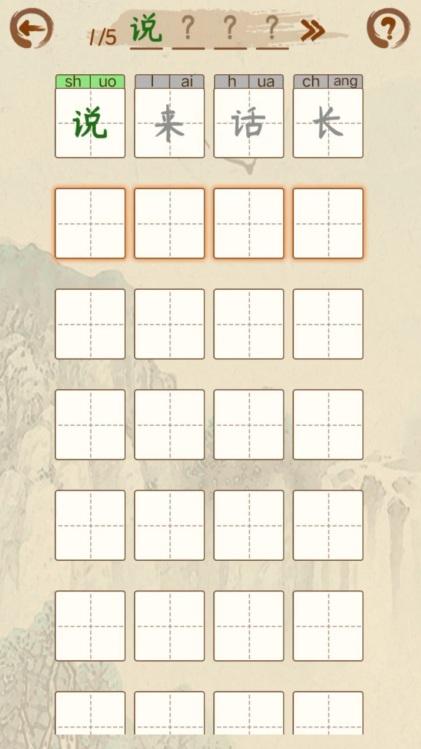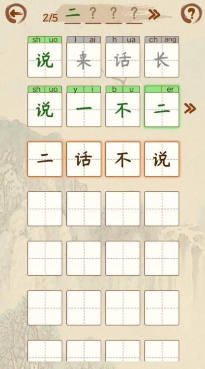 游戏以猜成语为核心,通过对音标的尝试和字的位置的尝试来猜测出最后的成语,而这个过程往往也是不短的。因为游戏开局它是没有任何提示的,只是一张白纸。而你要通过随意写一个成语来观察音标的位置和对错来进行下一步猜测,其中运气的成分要远大于玩家的思考。