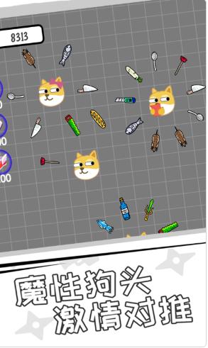 2、玩家将在游戏中自由收集自己喜欢的狗头表情,然后养成这些狗头开始作战,合理结合身边的武器,消灭来袭的敌人!此外,通过游戏内的召唤还能解锁更多有趣可爱的表情头像参与战斗。
