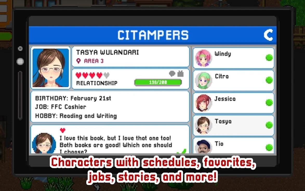 爱情和生活模拟RPG游戏给玩家破解成可以免体验付费内容,这是一款经营模拟类型的游戏,您在游戏中将跟随着剧情做出选择,认真扮演好角色,在游戏中认识许多的人物,并找工作生存下来,游戏的画面采用像素的风格,看起来很复古,剧情故事也是循序渐进的;