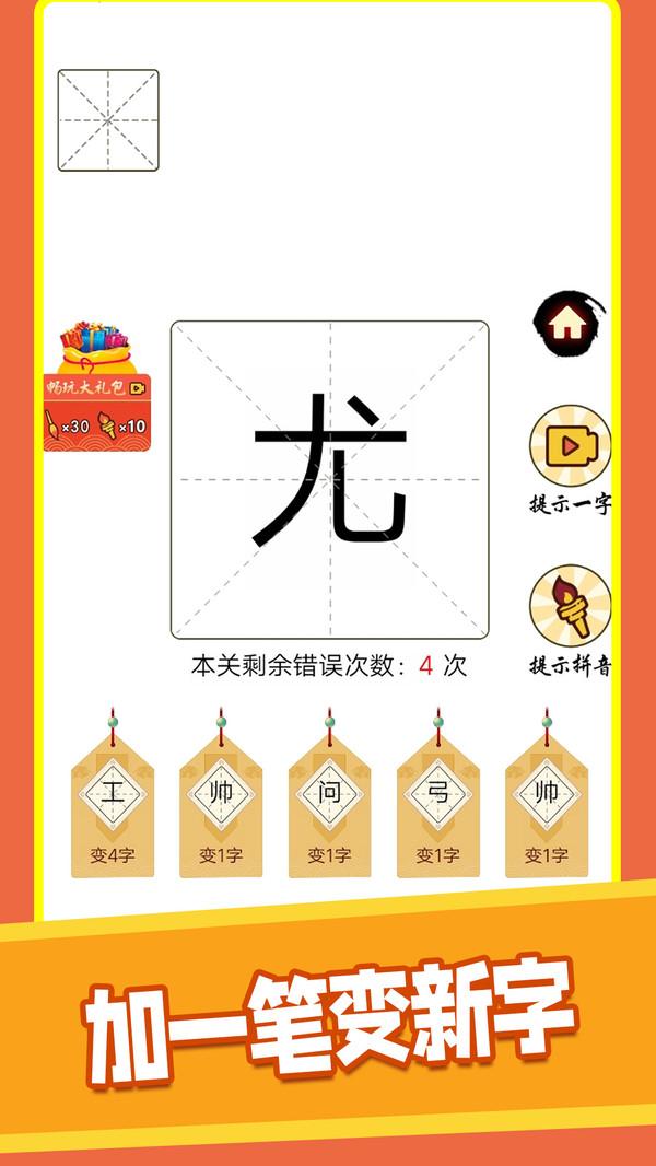 -自由的为各种汉字添加笔画,让文字变成其他的汉字成功过关。