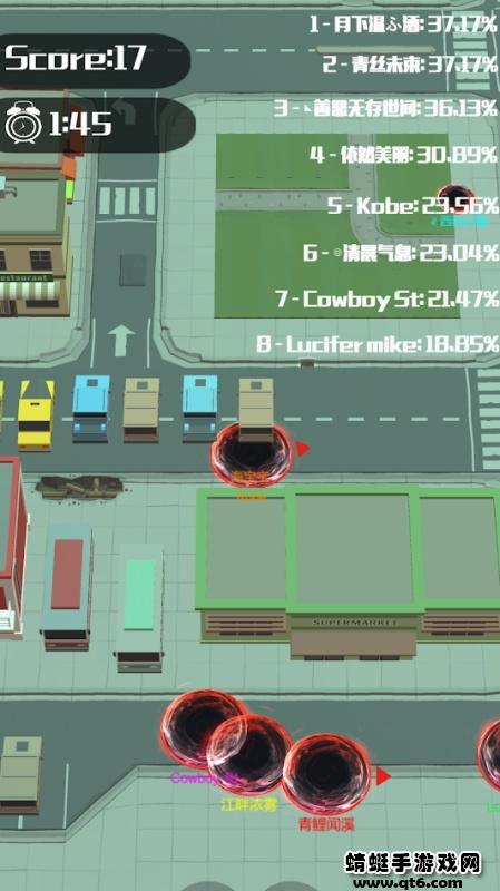 首先,你要扮演一个黑洞,不断吞噬游戏地图中的各种物品,前期你很小,能吞的只有人或路灯**桶的Σ(д;),没关系,这游戏就讲究猥琐发展,尽量前期不要盲目去吞其他黑洞,邓爷爷说过:“发展才是硬道理”(),到了中期,你越来越大,像汽车就可以随心所欲的吞了,汽车好吞,站马路上,来尽管轧我,