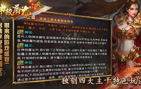 哆乐神技屠龙传奇游戏来袭,刺激复古传奇竞技,神器传奇,三职业传奇竞技,三种职业之间相互平衡,战士激情物理功力拉满,法师法力拉满,无限传奇累充返利,千元赞助扶持,传奇礼包奖励:材料宝箱*8,绑定灵符*5000,绑定元宝*50000,万元传奇真实红包轻松获取,成为传奇会员,杀怪轻松爆资源,非常值得去尝试的传奇竞技冒险游戏。
