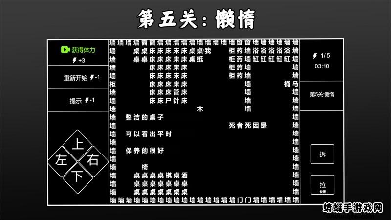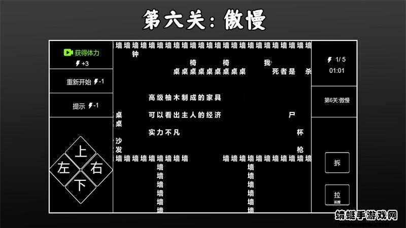 3.游戏玩法:利用方向键控制“我”进行移动,使用“拆”和“拉”破解文字信息,侦破各种案件。