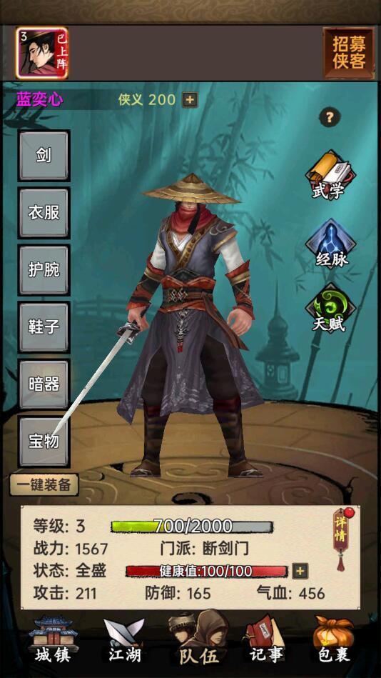 武林群侠传是一款武侠风格的角色扮演游戏,这个游戏已经给大家破解成了可以免广告获得奖励,在游戏中玩家可以成为武林中的传奇人物,您需要完成各种委托任务,在江湖里面进行冒险,获得各种武功心法进行修炼,与敌人进行战斗;