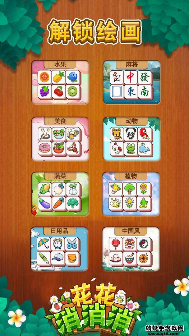 -多种皮肤和主题:水果、动物与自然、麻将、美食、动物、日用品、蔬菜、植物、中国风。。。通过章节即可解锁!