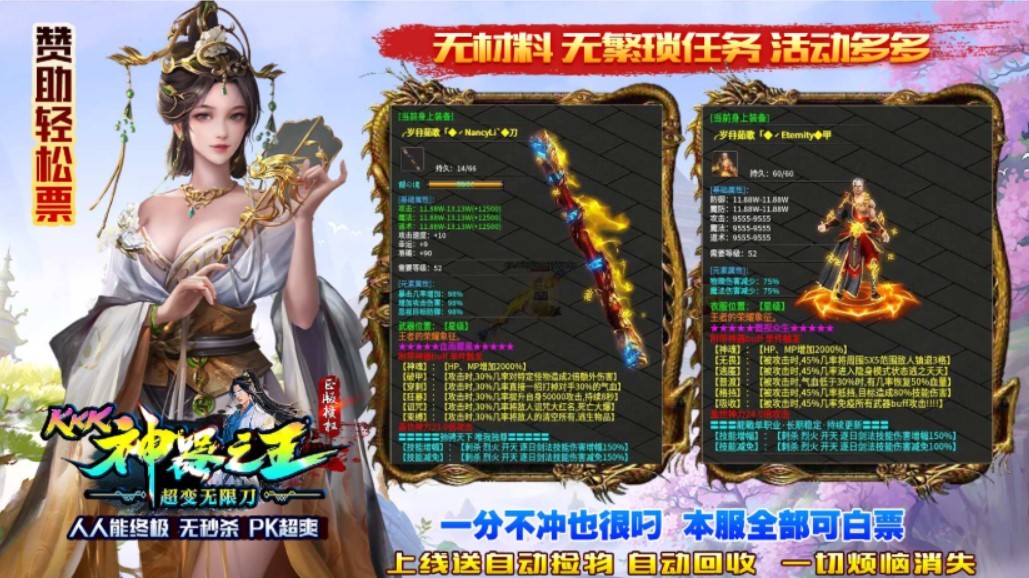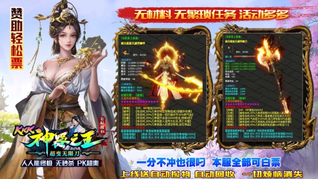kkk神器之王传奇竞技游戏来袭,神器资源版本,传奇地图不断刷新,不断轻松尝试探索,神器资源版本,无限激情的传奇争斗大战,传奇地图不断刷新,传奇专区开放,非常美妙的传奇竞技感受,激情无限的散人竞技感受,传奇礼包奖励:自动回收卡*1,自动拾取*1,满攻速卷轴,非常值得去尝试的传奇竞技冒险游戏。
