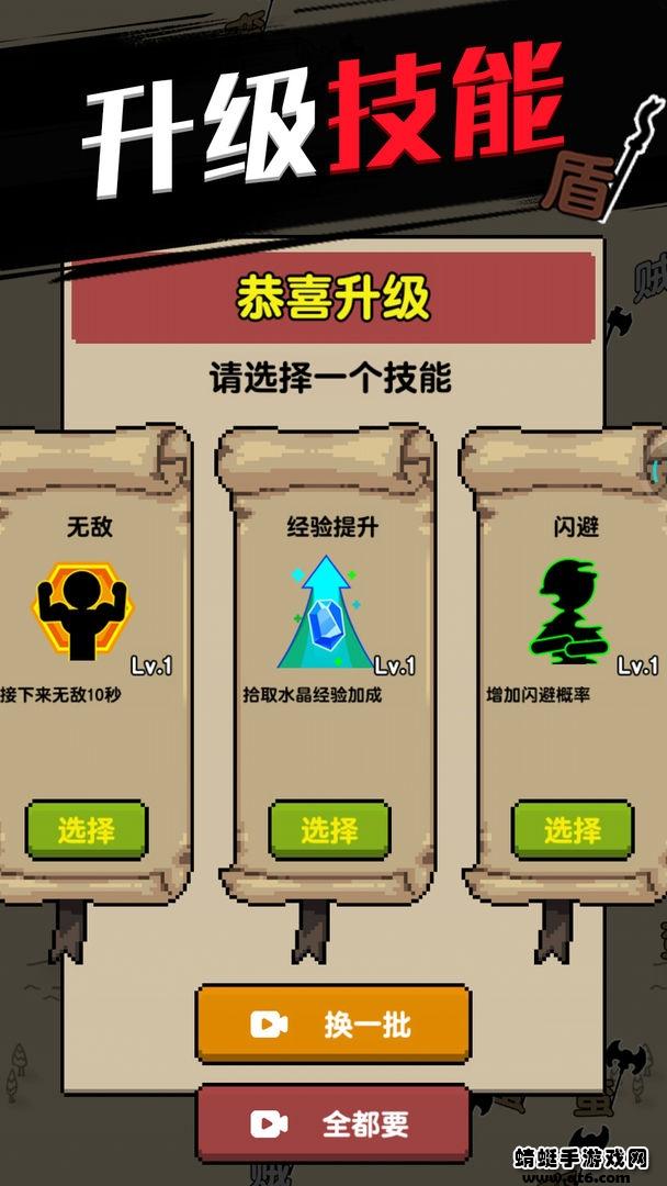 角色拾取一定的经验能量后可升级获得新技能来使角色变强,击败更多的怪物。