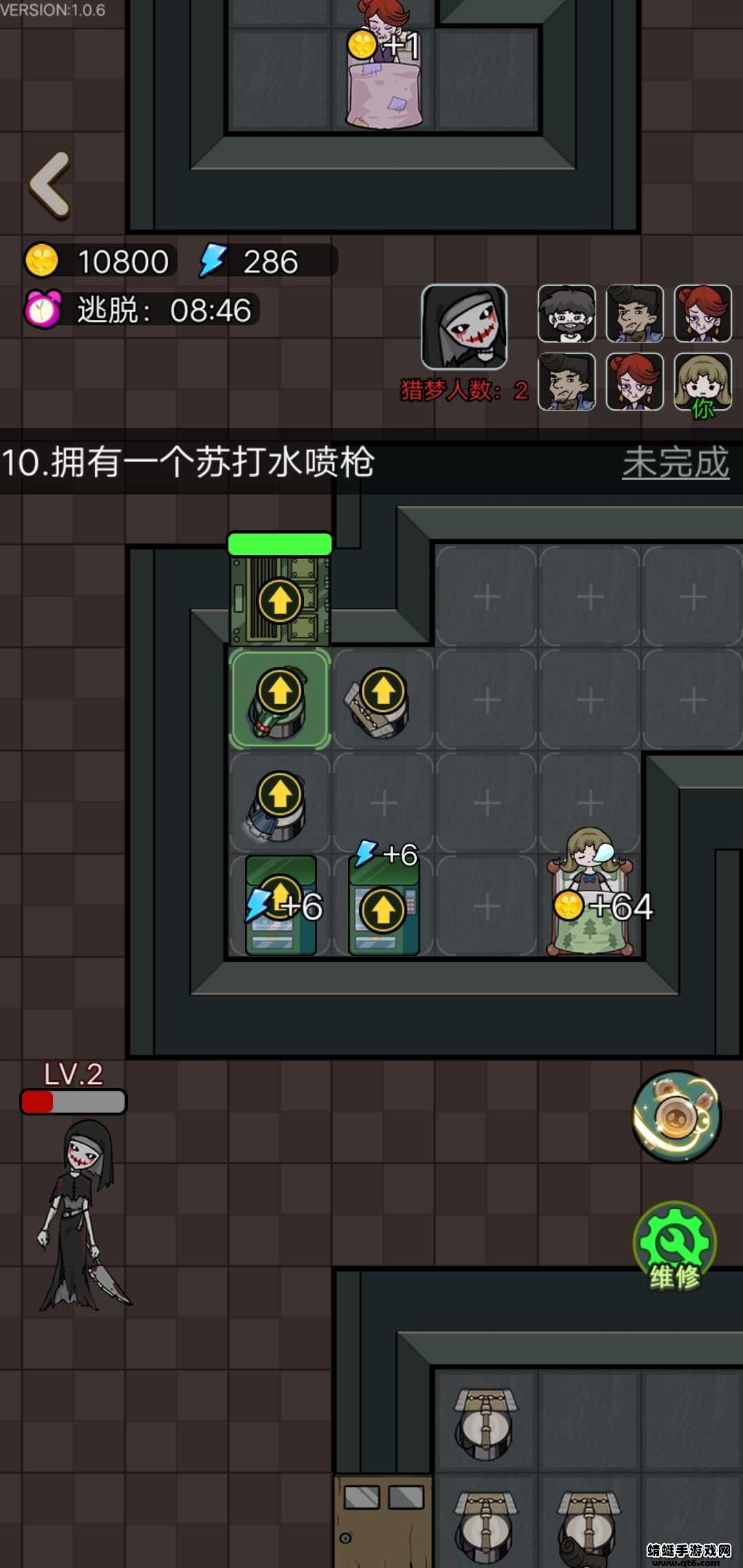 猎梦宿舍游戏中唯一的输出手段,每升一级输出会翻一倍,在于多而不在于精!炮台一定要造很多,而不要照着一个炮台一直升级,同时要注意炮台的攻击距离,避免造太远打不到鬼的情况
