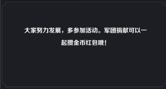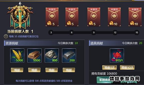 点击捐献对应的资源和道具,即可获得对应的贡献值和军团资金。激活对应的捐献人数即可激活对应的红包。