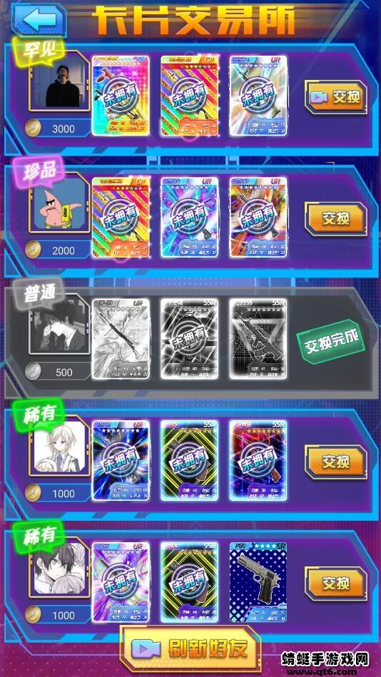 吃鸡换卡王是一款休闲的卡牌游戏,这个游戏可以免广告获得奖励,在这里您可以使用自己的卡牌来与他人的卡牌进行交换,收集一整套稀有的卡牌,让大家都羡慕你,游戏的画面非常的绚丽,越是珍稀的卡牌就越精美,看看您能否获得;