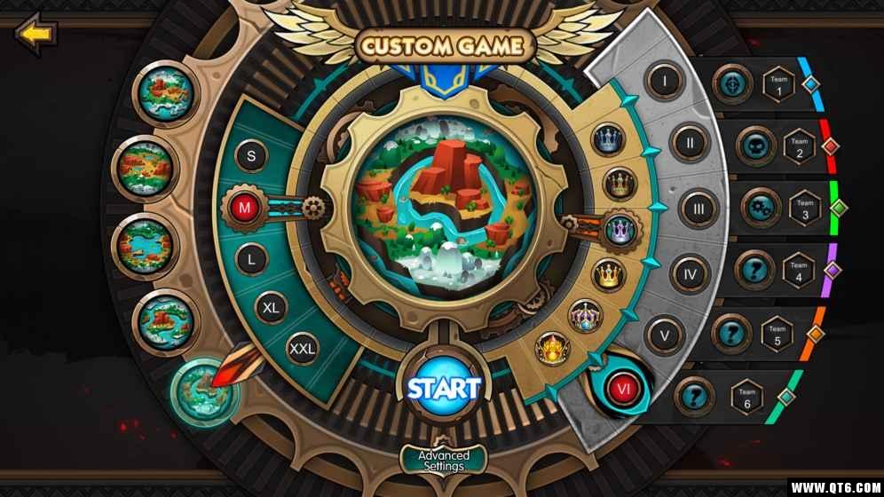 每局游戏的地图会通过算法随机生成,确保每局游戏都有全新的体验。共有5种不同类型的地图,大陆,大平原,地中海,群岛和环岛。最多支持6个军团同场竞技。