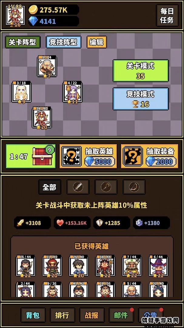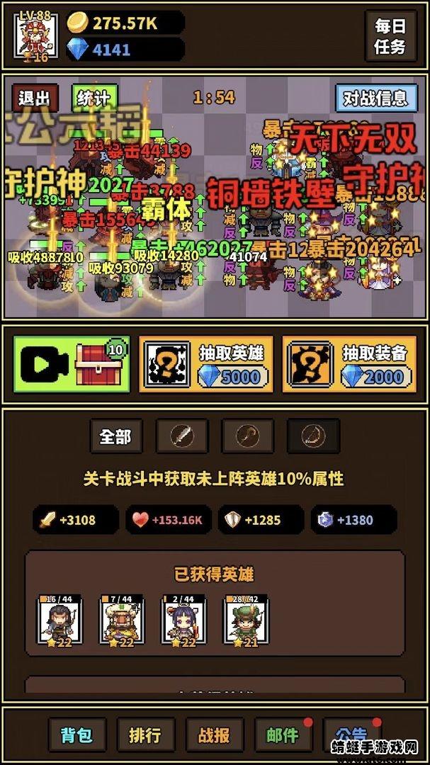 3、竞技模式,所有英雄都为相同等级,靠强力的装备和合理的阵型搭配才能赢得胜利。