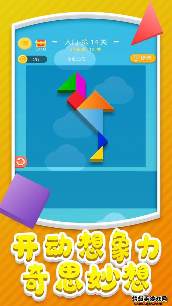 七巧板世界中将会将我们大家童年都接触过的七巧板放入到游戏中为玩家满提供多样的七巧板的闯关乐趣,你可以不断的通过对于七巧板的变化来进行游戏的闯关,每一关的关卡都会要求不一样的图形等待你的解锁。