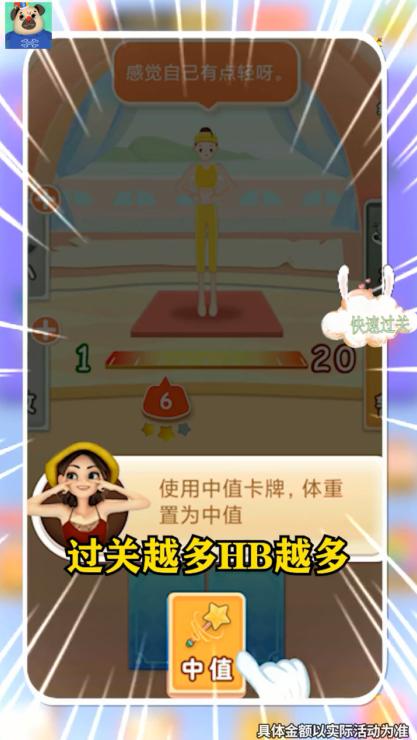 体重大比拼红包版的游戏玩法非常的简单有趣,你只需要动一动你的手指帮助我们的的游戏中的角色进行减肥即可,趣味的画面加上超多的关卡模式让整个游戏变得更加具有可玩性,老少皆宜,成功的闯关过后还能得到丰厚的奖励。