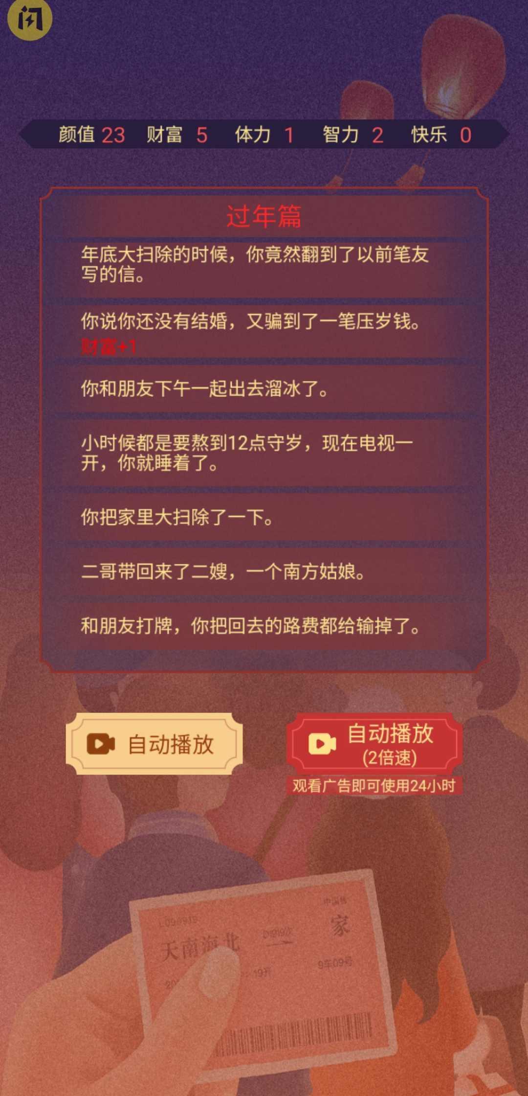 春运模拟游戏当前版本是免广告获得奖励版,下载玩耍这款游戏将带领玩家感受春运的氛围。这是一款类似于人生模拟的文字游戏,快过年了,快快下载感受一下过年的气氛吧!
