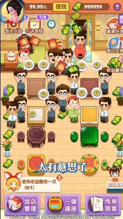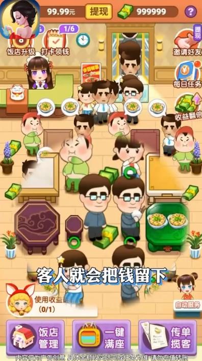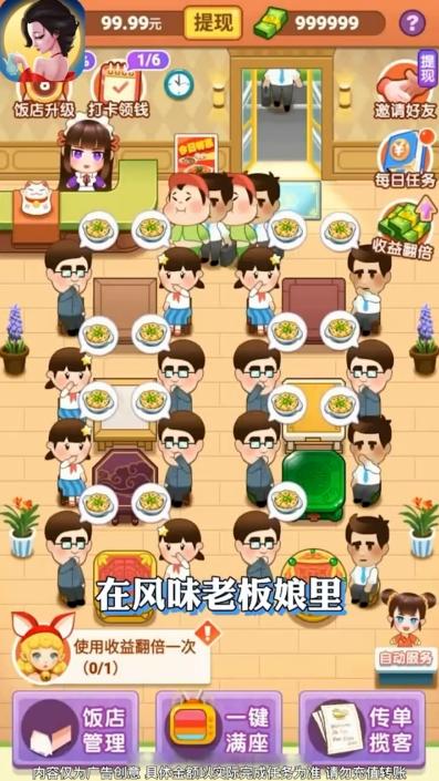 风味老板娘红包版相信大家都看过一部叫做风味人间的电影吧,讲述了关于情感越美食的联系的故事,在这个游戏中你也需要用你经营的饭店的美食来满足客人们的味蕾传递真正的服务精神和情感让顾客一次又一次的光顾的店铺,完成任务还可以获得红包奖励。